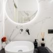 Un tavolo di cristallo finito da poltroncine di tessuto grigio completano l’ambiente. Il bagno è fine ed elegante. La camera è caratterizzata da una carta da parati disegnata da noi, con un carattere deciso riprende il tema come le sue lampade a comodino. Smart tv per la sala e la camera.